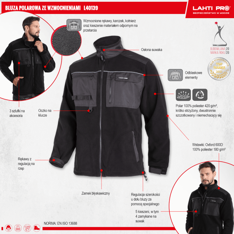 Bluza z polaru o gramaturze 420 g/m², z wstawkami z wytrzymałego materiału Oxford 600D. Posiada 5 kieszeni, z czego 4 są zamykane na suwak. Wyposażona w zamek błyskawiczny z osłoną. Odblaskowe elementy zwiększają widoczność. Bluza posiada oczko na klucze i 3 szlufki na akcesoria. Rękawy regulowane na rzep, a szerokość na dole bluzy jest regulowana za pomocą specjalnego ściągacza. Wzmocnienia na rękawach, karczku, kołnierzu i kieszeniach zapewniają odporność na przetarcia. Zgodna z normą EN ISO 13688.